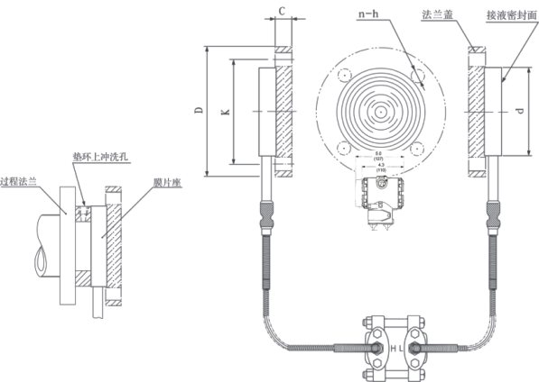 AK-3051DP雙法蘭液位變送器是一種通過(guò)安裝在管道或容器上的遠(yuǎn)傳裝置來(lái)感受被測(cè)壓力,該壓力經(jīng)毛細(xì)管內(nèi)的灌充硅油(或其它的液體)傳遞至變送器的主體,然后由變送器主體內(nèi)的δ室和放大線路板,將壓力或差壓轉(zhuǎn)換4~20mA.DC信號(hào)輸出(參見結(jié)構(gòu)原理圖)。 |