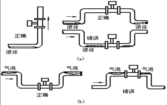 6. 測(cè)量氣體時(shí),在垂直管道安裝儀表,氣體流向不限。但若管道內(nèi)含少量液體,為了防止液體進(jìn)入儀表測(cè)量管,氣流應(yīng)自下而上流動(dòng),如圖(四)a所示